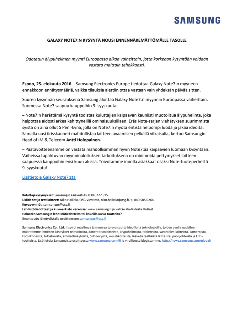 Galaxy Note7:n kysyntä nousi ennennäkemättömälle tasolle