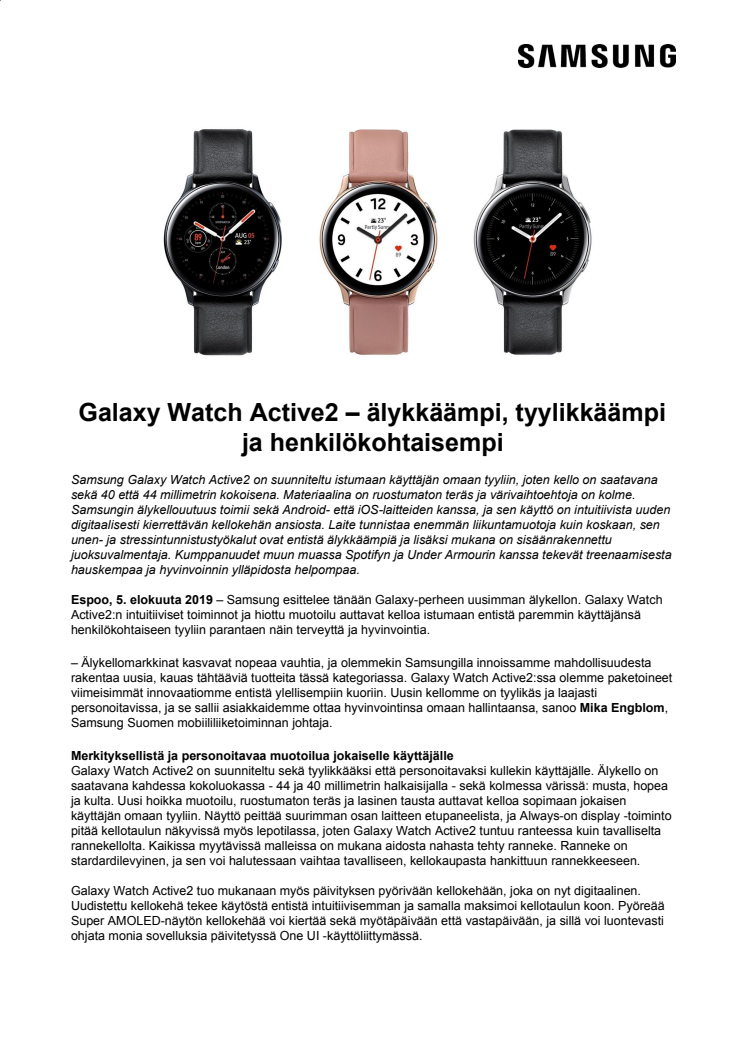 Galaxy Watch Active2 – älykkäämpi, tyylikkäämpi ja henkilökohtaisempi