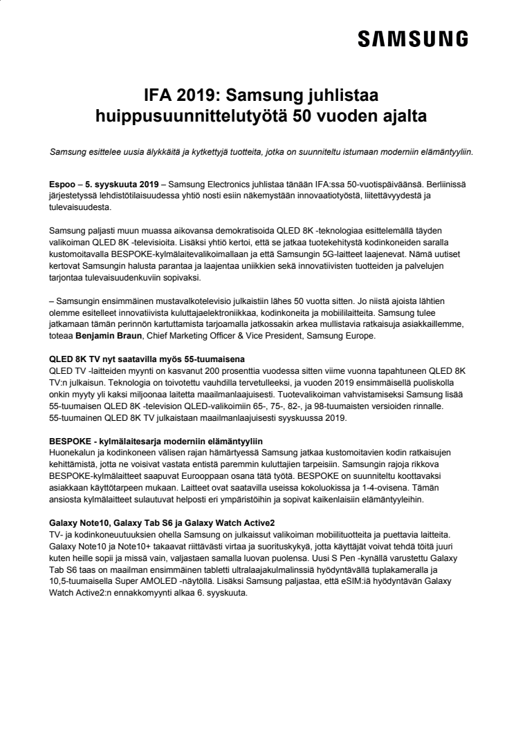 Samsung Electronics juhlistaa tänään IFA:ssa 50-vuotispäiväänsä. Berliinissä järjestetyssä lehdistötilaisuudessa yhtiö nosti esiin näkemystään innovaatiotyöstä, liitettävyydestä ja tulevaisuudesta.