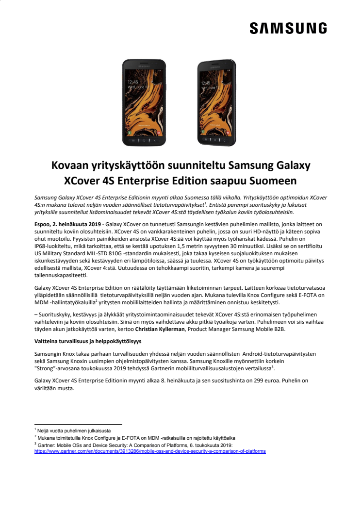 Samsung Galaxy XCover 4S Enterprise Editionin myynti alkaa Suomessa tällä viikolla. Yrityskäyttöön optimoidun XCover 4S:n mukana tulevat neljän vuoden säännölliset tietoturvapäivitykset . Entistä parempi suorituskyky ja lukuisat yrityksille suunnitellut lisäominaisuudet tekevät XCover 4S:stä täydellisen työkalun koviin työolosuhteisiin.
