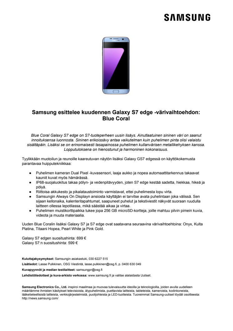 Samsung esittelee kuudennen Galaxy S7 edge -värivaihtoehdon: Blue Coral
