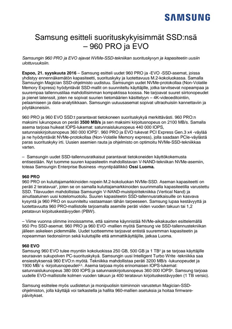 Samsung esitteli suorituskykyisimmät SSD:nsä – 960 PRO ja EVO