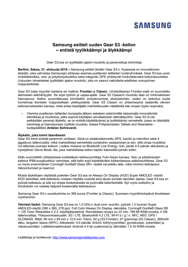 Berliini, Saksa, 31. elokuuta 2016 – Samsung esitteli tänään Gear S3:n. Kyseessä on innovatiivinen älykello, joka vahvistaa Samsungin johtavaa asemaa puettavien laitteiden tuoteryhmässä. Gear S3:ssa uusin mobiilitekniikka, vesi- ja pölytiiveysluokitus sekä integroitu GPS yhdistyvät houkuttelevaksi kokonaisuudeksi.
