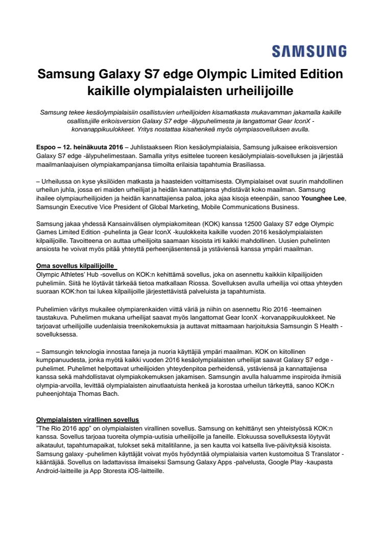 Samsung Galaxy S7 edge Olympic Limited Edition kaikille olympialaisten urheilijoille