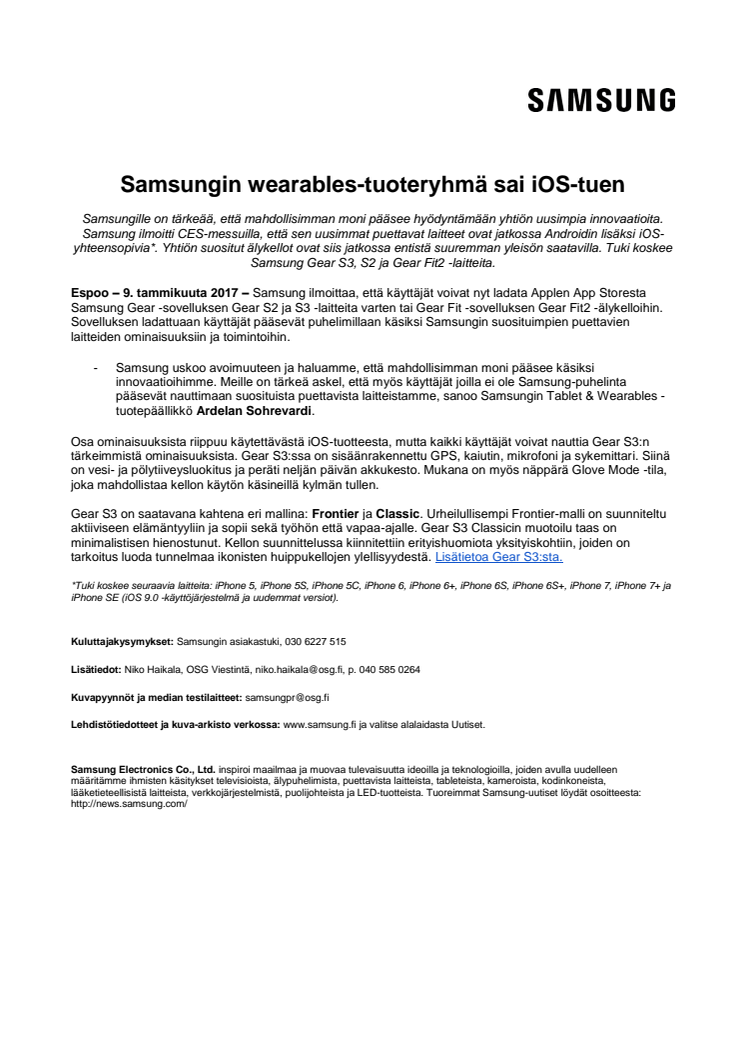 Samsungille on tärkeää, että mahdollisimman moni pääsee hyödyntämään yhtiön uusimpia innovaatioita. Samsung ilmoitti CES-messuilla, että sen uusimmat puettavat laitteet ovat jatkossa Androidin lisäksi iOS-yhteensopivia. Yhtiön suositut älykellot ovat siis jatkossa entistä suuremman yleisön saatavilla. Tuki koskee Samsung Gear S3, S2 ja Gear Fit2 -laitteita.