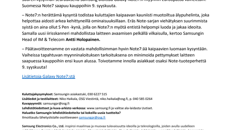 – Päätavoitteenamme on vastata mahdollisimman hyvin Note7:ää kaipaavien luomaan kysyntään. Vaiheissa tapahtuvan myynninaloituksen tarkoituksena on minimoida pettymykset laitteen saapuessa kauppoihin ensi kuun alussa. Toivotamme innolla asiakkaat osaksi Note-tuoteperhettä 9. syyskuuta!