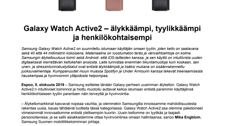 – Älykellomarkkinat kasvavat nopeaa vauhtia, ja olemmekin Samsungilla innoissamme mahdollisuudesta rakentaa uusia, kauas tähtääviä tuotteita tässä kategoriassa. Galaxy Watch Active2:ssa olemme paketoineet viimeisimmät innovaatiomme entistä ylellisempiin kuoriin. Uusin kellomme on tyylikäs ja laajasti personoitavissa, ja se sallii asiakkaidemme ottaa hyvinvointinsa omaan hallintaansa, sanoo Mika Engblom, Samsung Suomen mobiililiiketoiminnan johtaja.
