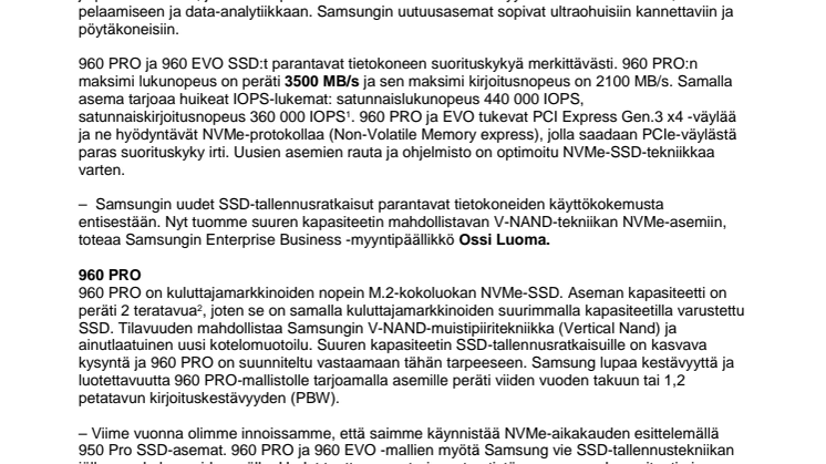 – Viime vuonna olimme innoissamme, että saimme käynnistää NVMe-aikakauden esittelemällä 950 Pro SSD-asemat. 960 PRO ja 960 EVO -mallien myötä Samsung vie SSD-tallennustekniikan jälleen askeleen pidemmälle. Uudet tuotteemme tarjoavat entistä suuremman kapasiteetin ja nopeamman tiedonsiirron sekä kuluttajille että ammattikäyttäjille, jatkaa Luoma.