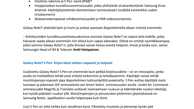 – Kehittyneiden turvallisuusominaisuuksiensa ansiosta Galaxy Note7 on sopiva laite kaikille, jotka haluavat saada aikaan enemmän niin töissä kuin vapaa-aikanakin. Elämä on entistä vauhdikkaampaa, joten loimme Galaxy Note7:n, jolla ihmiset voivat hoitaa asioita helposti, missä ja koska vain, sanoo Samsungin Head of IM & Telecom Antti Holopainen.