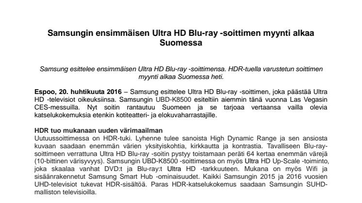 Espoo, 20. huhtikuuta 2016 – Samsung esittelee Ultra HD Blu-ray -soittimen, joka päästää Ultra HD -televisiot oikeuksiinsa. Samsungin UBD-K8500 esiteltiin aiemmin tänä vuonna Las Vegasin CES-messuilla. Nyt soitin rantautuu Suomeen ja se tarjoaa vertaansa vailla olevia katselukokemuksia etenkin kotiteatteri- ja elokuvaharrastajille.