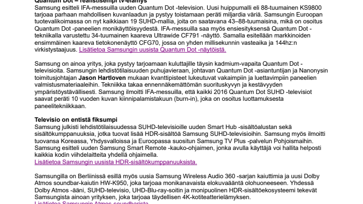 Samsung esitteli IFA-messuilla uuden Quantum Dot -television. Uusi huippumalli eli 88-tuumainen KS9800 tarjoaa parhaan mahdollisen kuvanlaadun ja pystyy toistamaan peräti miljardia väriä. Samsungin Euroopan tuotevalikoimassa on nyt kaikkiaan 19 SUHD-mallia, joita on saatavana 43–88-tuumaisina, mikä on osoitus Quantum Dot -paneelien monikäyttöisyydestä. IFA-messuilla saa myös ensiesityksensä Quantum Dot -tekniikalla varustettu 34-tuumainen kaareva Ultrawide CF791 -näyttö. Samalla esitellään markkinoiden ensimmäinen kaareva tietokonenäyttö CFG70, jossa on yhden millisekunnin vasteaika ja 144hz:n virkistystaajuus. Lisätietoa Samsungin uusista Quantum Dot -näytöistä.