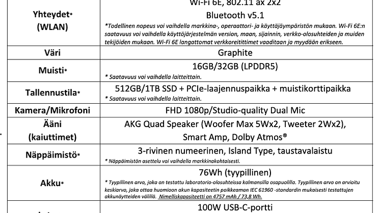 [11] GPU:n tekniset tiedot voivat vaihdella mallin, maan tai alueen mukaan.